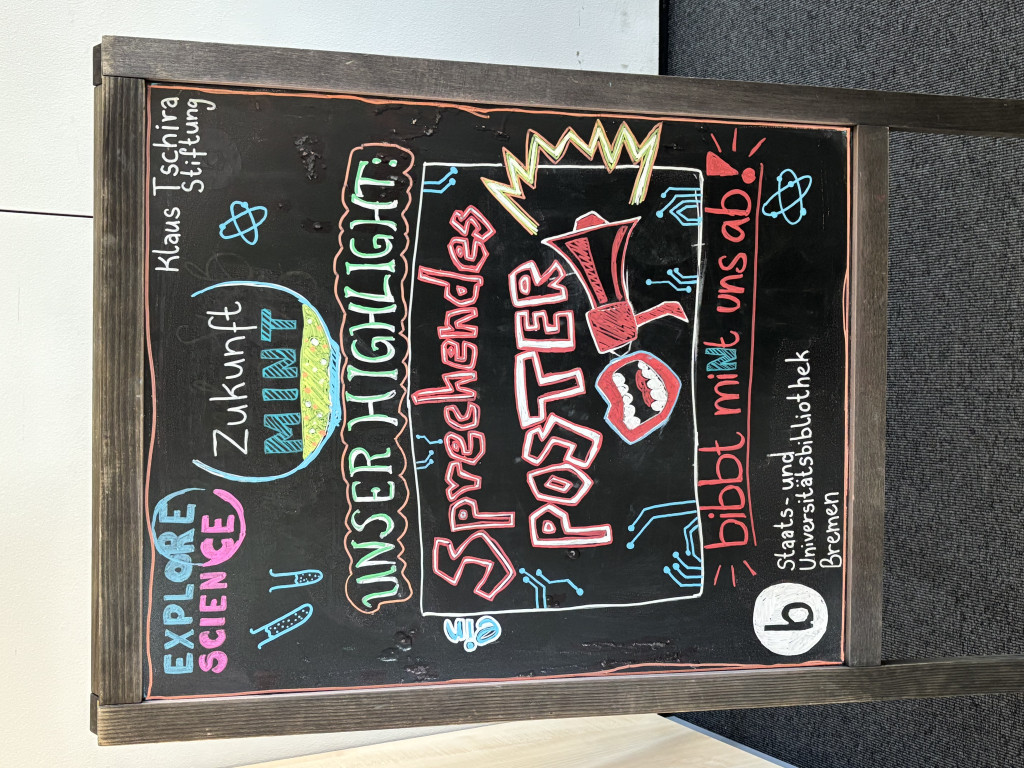 Ein Highlight dabei ist sicherlich unser sprechendes Poster. Mit Hilfe von Makey Makey, Scratch und Kupferband haben wir ein interaktives Plakat entwickelt, das beim Berühren zum Leben erwacht. So kann man auf spielerische Weise mehr über die Services und Angebote der SuUB erfahren – von der Recherche im Katalog bis hin zu unseren Lern- und Arbeitsmöglichkeiten.